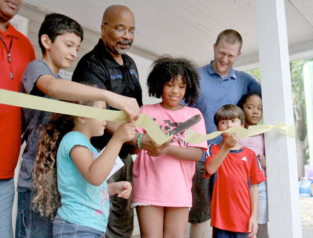 Veronica Camacho, 8, cuts the ribbon during the reopening of Johnson Reeves Playground in Bridgeton, Thursday, Aug. 20, 2015. (Joe Warner | For NJ.com)